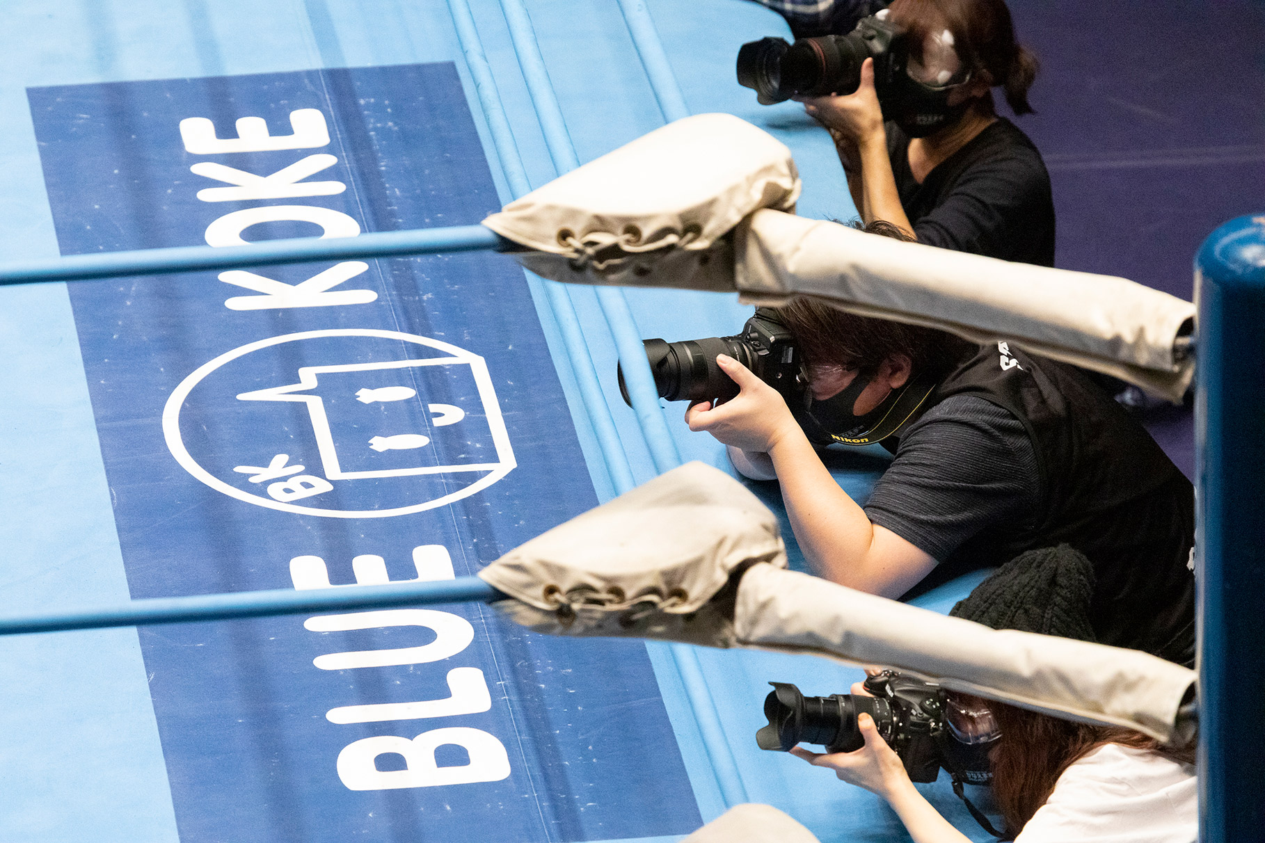 ゴングがなり、序盤から早くも目の前の攻防は激しさを加速していきます!できる限り近くで!より迫力を!より熱さを!写真に収めるべく3人はリングに乗り出しシャッターを切っていきます!しかしリング上での闘いは誰も予想ができません!身を乗り出してたところに急に選手達が倒れこんだり、吹っ飛ばされたりしてくるのです!