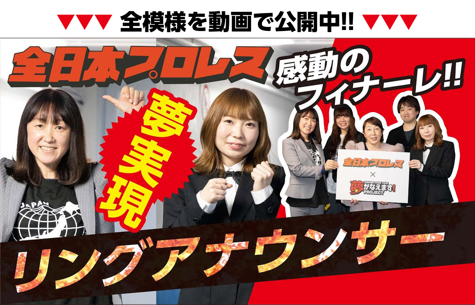この舞台に一般応募から選ばれた2人の夢、「スタッフとして役に立ちたい!」「大好きな選手を紹介したい!」という熱い想いを全日本プロレスと夢かなえます!PROJECTが受け止め、なんとリングアナウンサーに挑戦することで夢をかなえました。